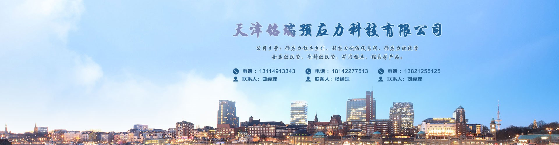 天津銘瑞預(yù)應(yīng)力科技有限公司是專業(yè)研發(fā)銷售:預(yù)應(yīng)力錨具和預(yù)應(yīng)力鋼絞線系列及預(yù)應(yīng)力波紋管、金屬波紋管、塑料波紋管、預(yù)應(yīng)力錨具、礦用錨具、錨具、地下室囊式預(yù)應(yīng)力抗浮錨桿、囊式擴(kuò)大頭抗浮錨桿、囊體抗浮錨桿 擴(kuò)大頭抗浮錨桿、精軋螺紋鋼抗浮錨桿等系列產(chǎn)品。公司坐落于天津市子牙經(jīng)濟(jì)開(kāi)發(fā)區(qū)高新產(chǎn)業(yè)園高速輔路10號(hào),注冊(cè)資金1000萬(wàn)元,是華北地區(qū)預(yù)應(yīng)力鋼絞線及錨固體系的專業(yè)經(jīng)營(yíng)公司。  本公司積累了豐富的科研和工程實(shí)踐經(jīng)驗(yàn),在不斷完善產(chǎn)品質(zhì)量的同時(shí),致力于預(yù)應(yīng)力技術(shù)的研究與開(kāi)發(fā)。本公司愿與國(guó)內(nèi)外科研,設(shè)計(jì),施工單位,攜手合作,共同探索預(yù)應(yīng)力技術(shù)的新領(lǐng)域。